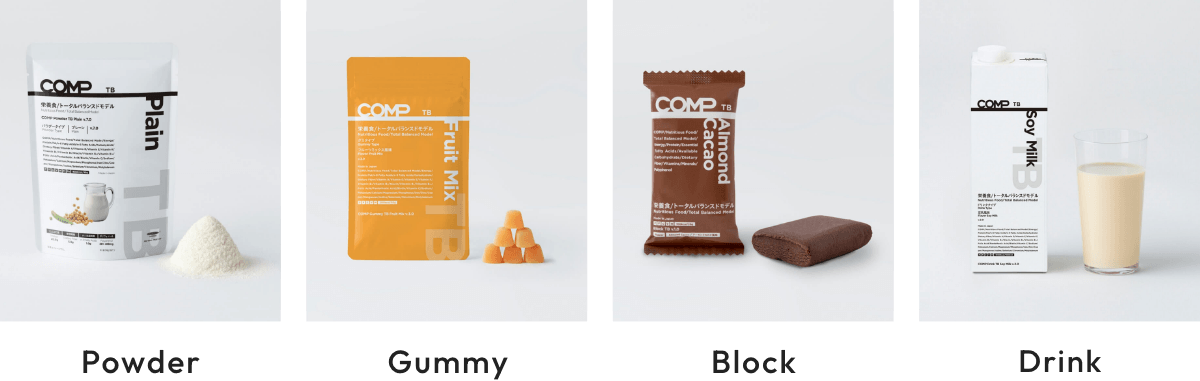 商品は、パウダー・グミ・ブロック・ドリンクの4タイプ。食事代わりから間食まで、シーンに合わせてお選びください。